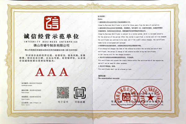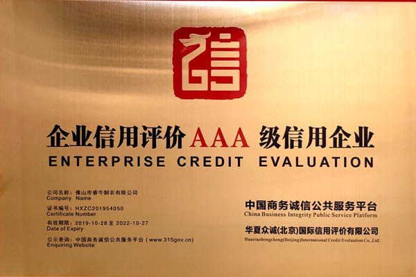 佛山市睿牛制衣有限公司——3A級(jí)誠(chéng)信經(jīng)營(yíng)示范單位;