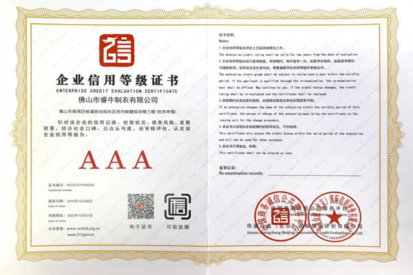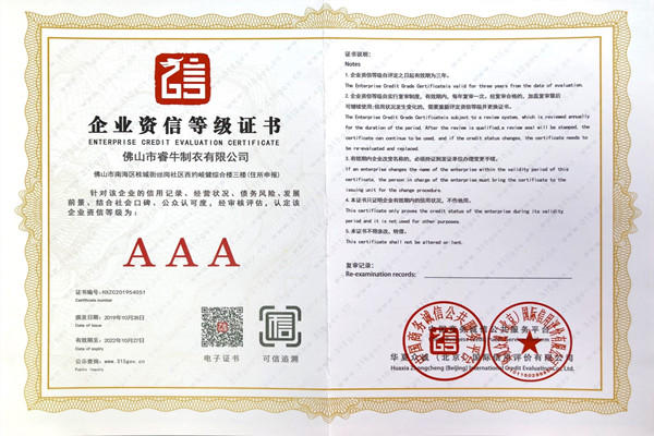 佛山市睿牛制衣有限公司——3A級(jí)企業(yè)資信等級(jí)證書(shū);