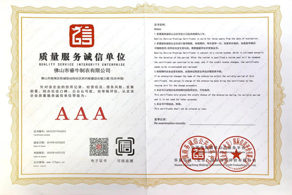 佛山市睿牛制衣有限公司——3A級(jí)質(zhì)量服務(wù)誠(chéng)信單位;