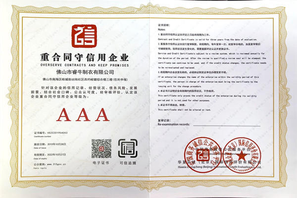 佛山市睿牛制衣有限公司——3A級(jí)重合同守信用企業(yè);