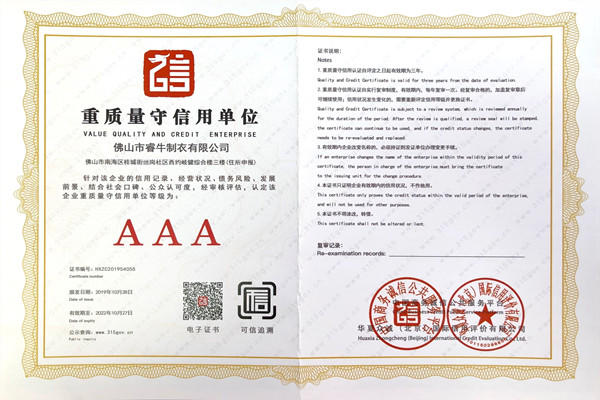 佛山市睿牛制衣有限公司——3A級(jí)重質(zhì)量守信用單位;