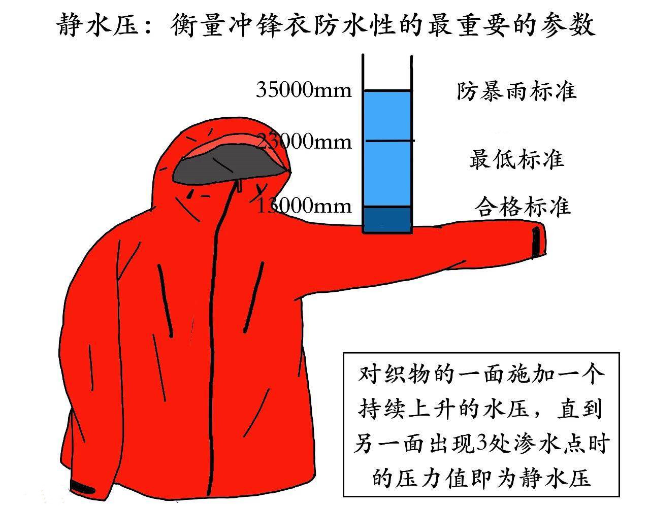 靜水壓越高,防水性越好——沖鋒衣靜水壓越高,表示抵抗被水滲透的能力越強,也就說明防水性越好。具體數據如下: