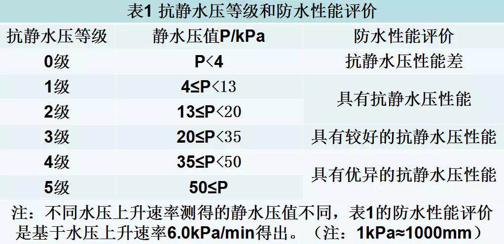 數據來自:GB/T4744-2013《紡織品 防水性能的檢測和評價 靜水壓法》