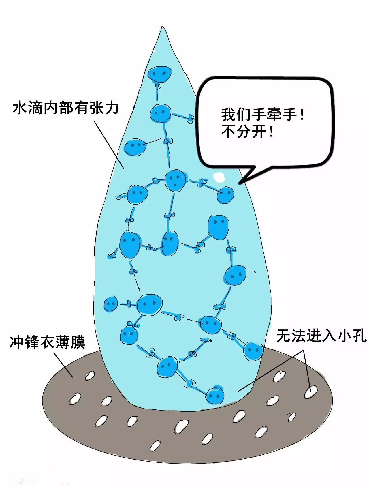 1)水滴內部的張力讓它無法進入薄膜。因為雨滴的“張力”很強,水分子之間強烈吸引,就像抱團在一起。當雨滴接觸薄膜時,沒有水分子愿意離開水滴。