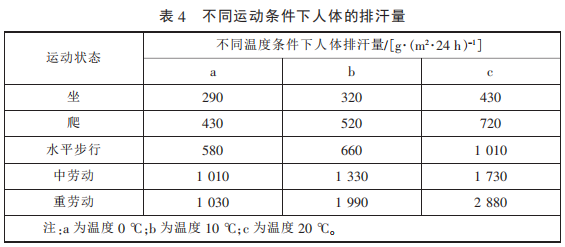 GB/T 32614—2016 中 功 能 性 指 標(洗 前)與 GB/T 21295—2014 《服裝理化性能的技術要求》對比 可知,GB/T 32614—2016 中對于拒 水、耐靜水壓和透濕率 3 項功能性 要求更高,尤其是Ⅰ類產品的耐靜 水壓和透濕率遠高于 GB/T 21295— 2014 的技術要求。兩標準對這 3 項 性能要求對比見 表 3。 滿 足 GB/T 32614—2016 的沖鋒衣可以抵擋暴 雨的沖擊,也滿足登山、攀巖等大 運動量下的透濕要求,不同條件下 人體的排汗量見表 4。