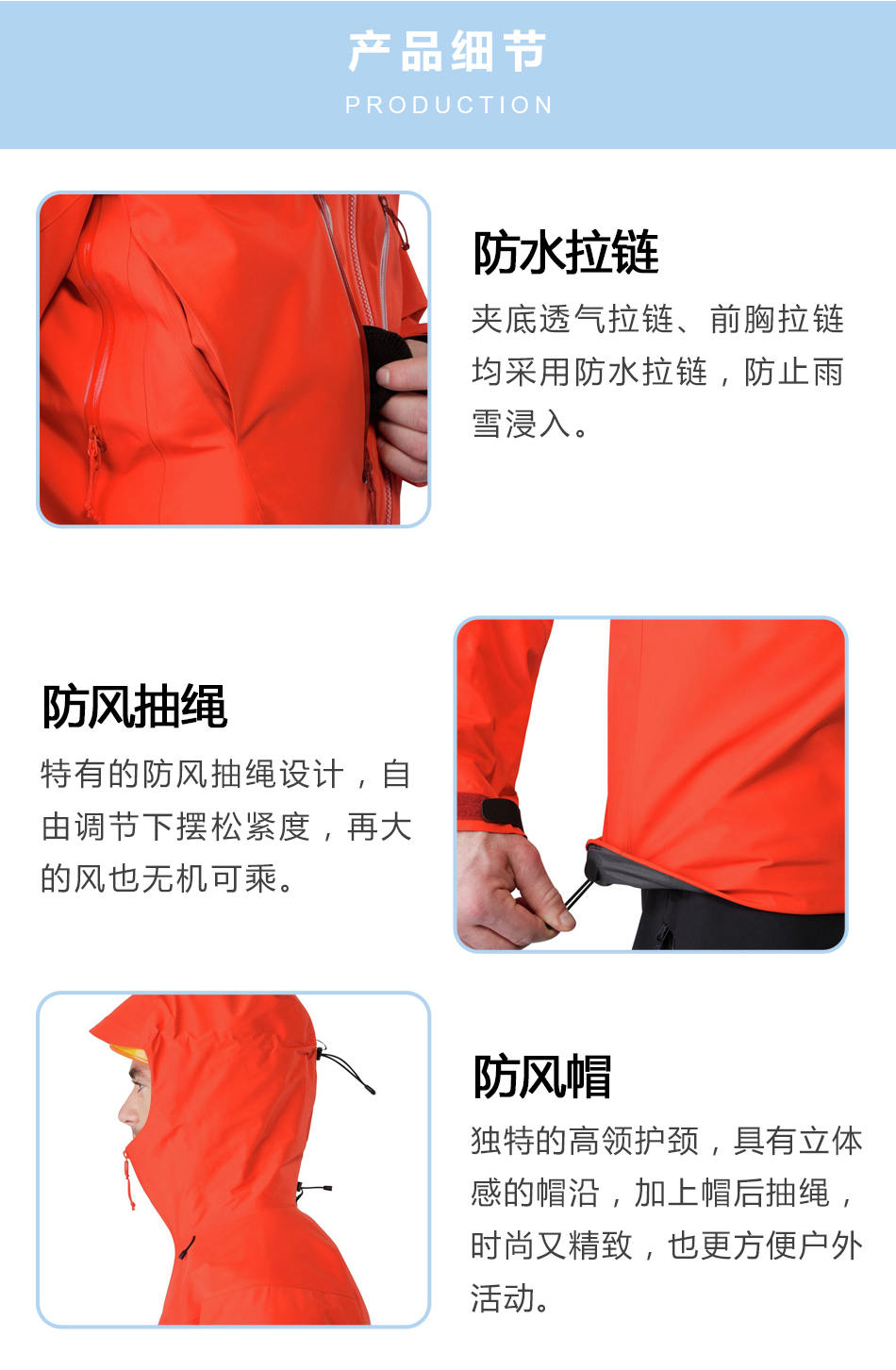 防風(fēng)帽:獨特的高領(lǐng)護頸,具有立體感的帽沿,加上帽后抽繩,時尚又精致,更方便戶外活動,專業(yè)沖鋒衣貼牌代工。