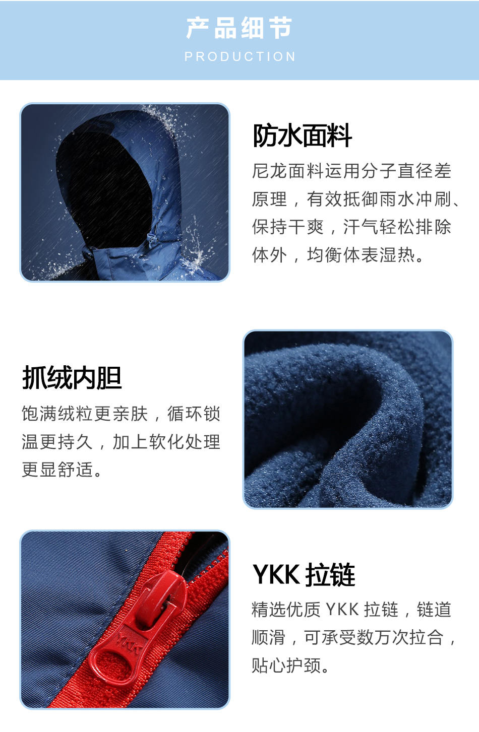 防水面料:尼龍面料運用分子直徑差原理,有效抵御雨水沖刷、保持干爽,汗氣輕松排除體外,均衡體表濕熱可根據(jù)沖鋒衣定制不同來選擇面料。