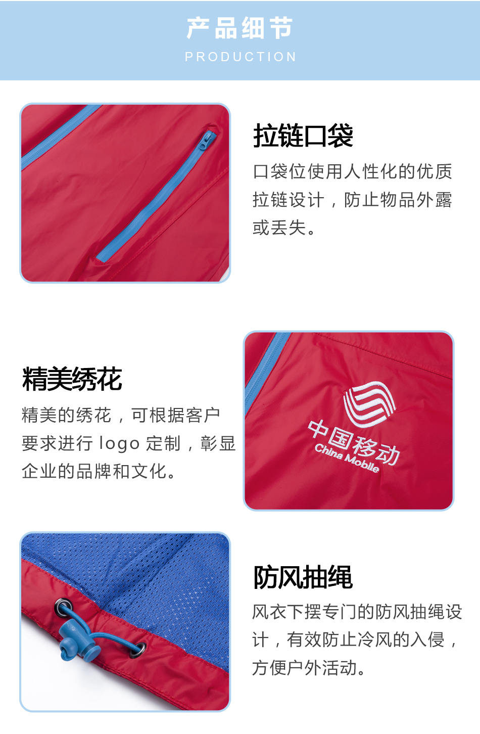 • 精美繡花:精美的繡花,可根據客戶要求單層風衣定制的logo設計,彰顯企業的品牌和文化。