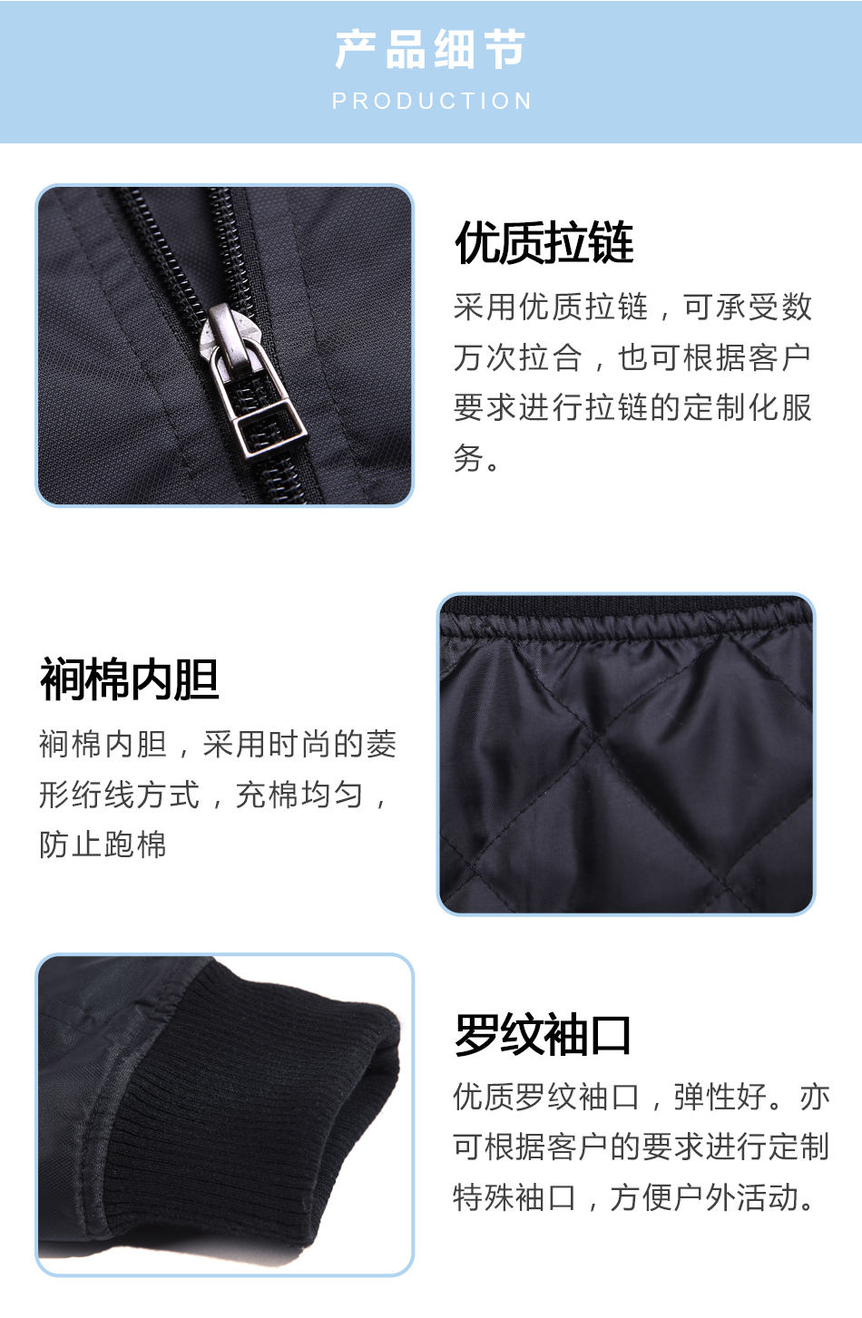 • 羅紋袖口:優質羅紋袖口,彈性好。亦可根據客戶的要求進行團體夾克定制其特殊袖口,方便戶外活動。