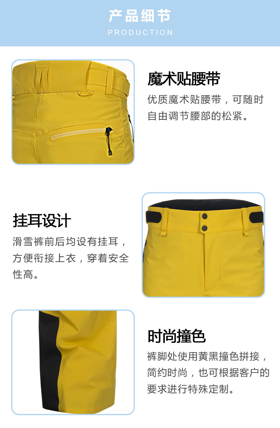 • 掛耳設計滑雪褲定制前后均設有掛耳,方便銜接上衣,穿著安全性高。