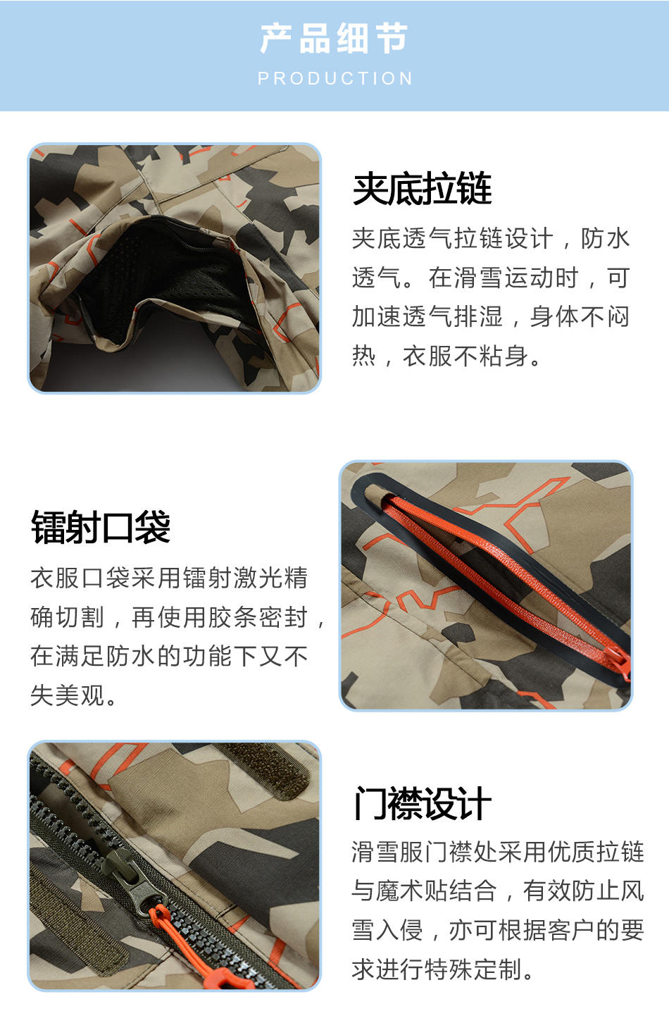 門襟設(shè)計:滑雪服門襟處采用優(yōu)質(zhì)拉鏈與魔術(shù)貼結(jié)合,有效防止風(fēng)雪入侵,亦可根據(jù)客戶的要求進(jìn)行特殊定制。