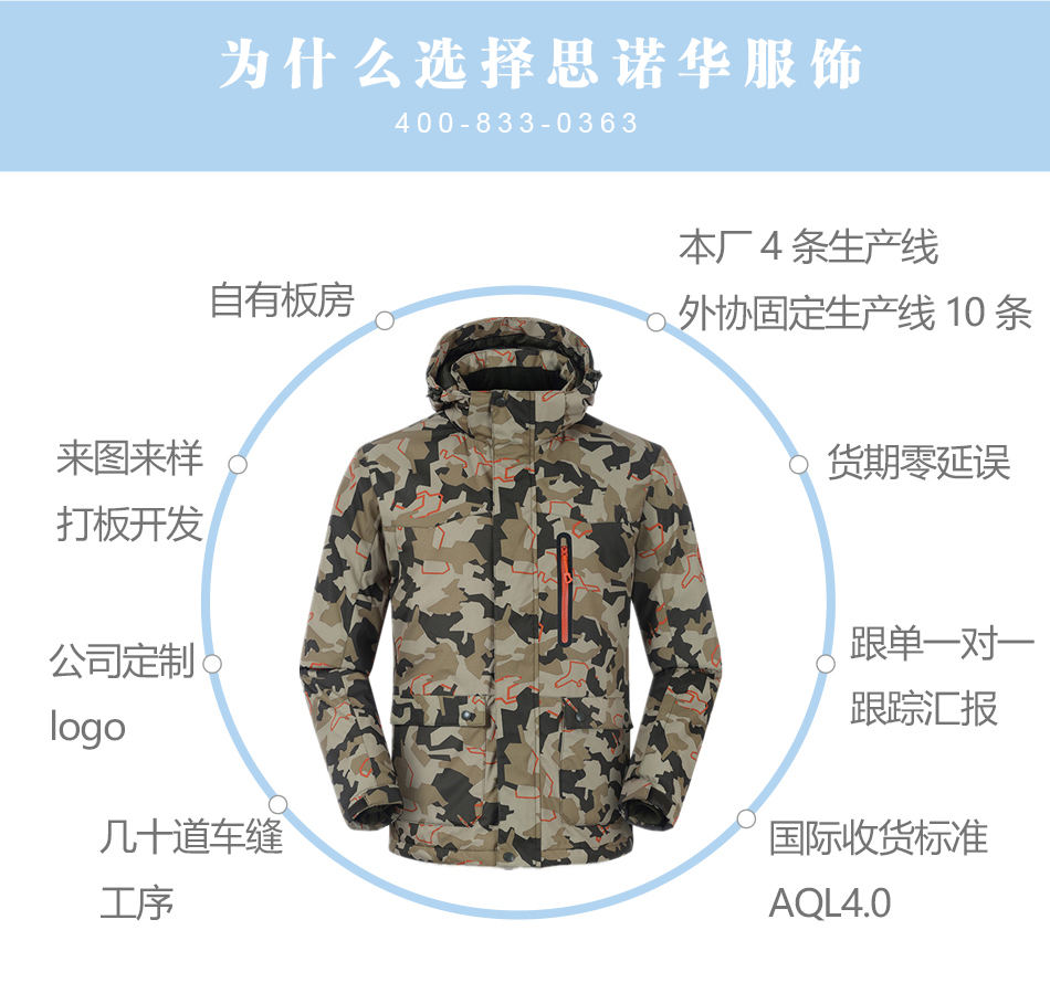 門襟設(shè)計:滑雪服門襟處采用優(yōu)質(zhì)拉鏈與魔術(shù)貼結(jié)合,有效防止風(fēng)雪入侵,亦可根據(jù)客戶的要求進(jìn)行特殊保暖滑雪服加工。